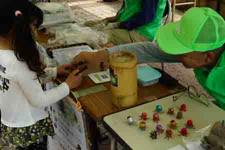 (左)ボランティアの説明員さんが簡単に作り方を説明します。(右)どんぐりに”おおきなまつげ”をつけた目を描きましたよ。