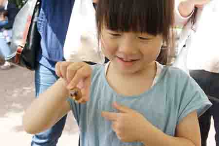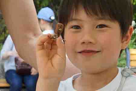 工作材料として”どんたこ”を提供しました。子どもたちは、竹の口を接着した どんぐりに 目を書き、光硬化性樹脂製胴に紙製足を差し込んだ足部と両面テープで止ることで完成します。