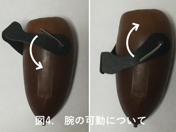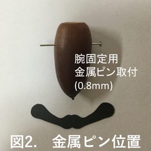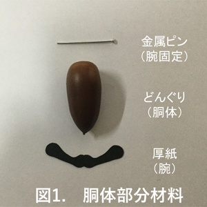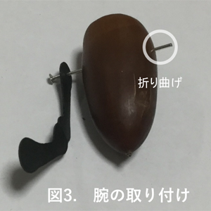 どんぐりにはピンバイスで0.8mmの穴を空けました。金属ピンをどんぐりに通しますが、紙の腕を金属ピンヘッド部分で押さえるように差し込みます。