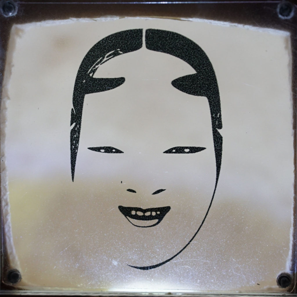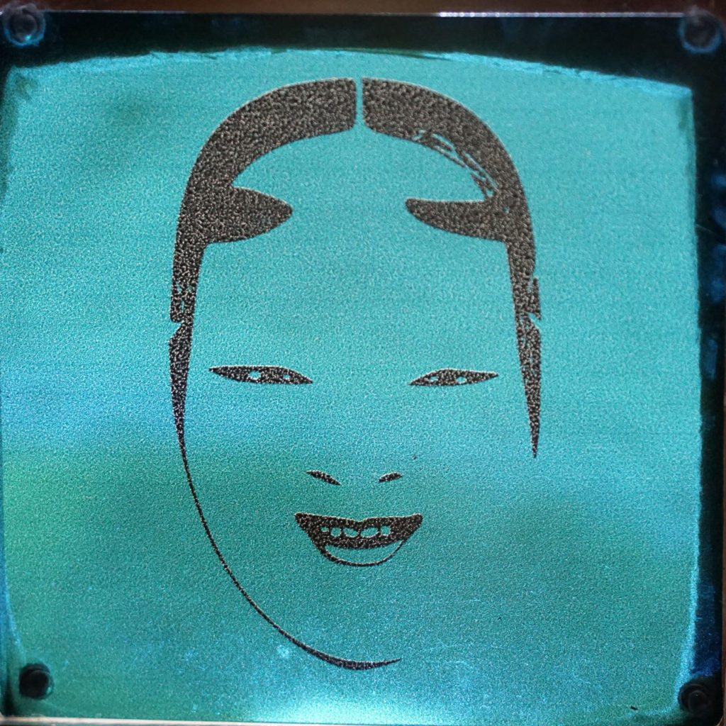 能面のデザインを印刷し、レーザー加工機でOHPシートを切断しました。光の当て方や光源を変えてみました。