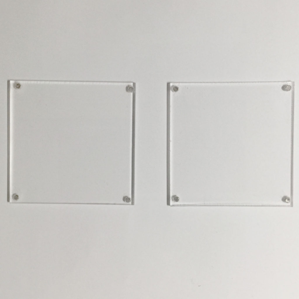 透明なアクリル板2枚にネオジウム磁石を付けてみました。アクリル板のサイズは5cm✖5cm (厚みは2~5mm)を2枚、ネオジウム磁石の大きさははφ2mm(厚み1mm)を8個使用しました。