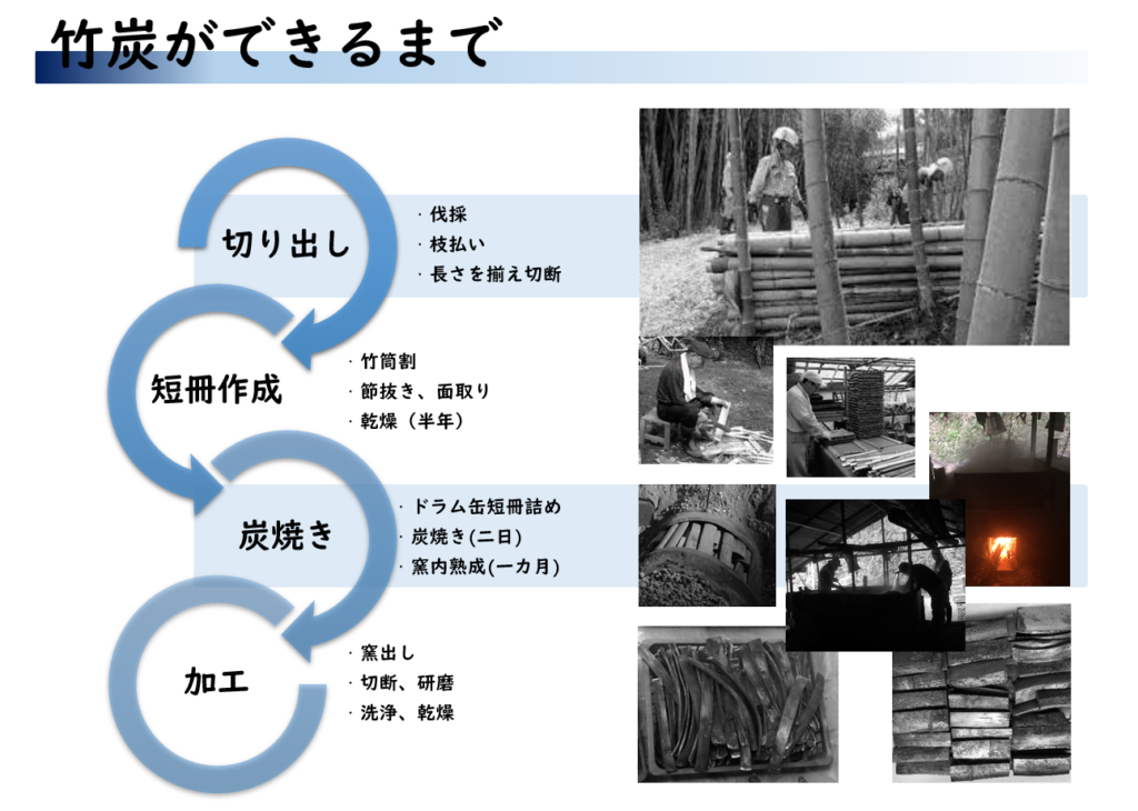一年かけて行う竹炭づくりは大きく4つ の工程 に分けることができます。