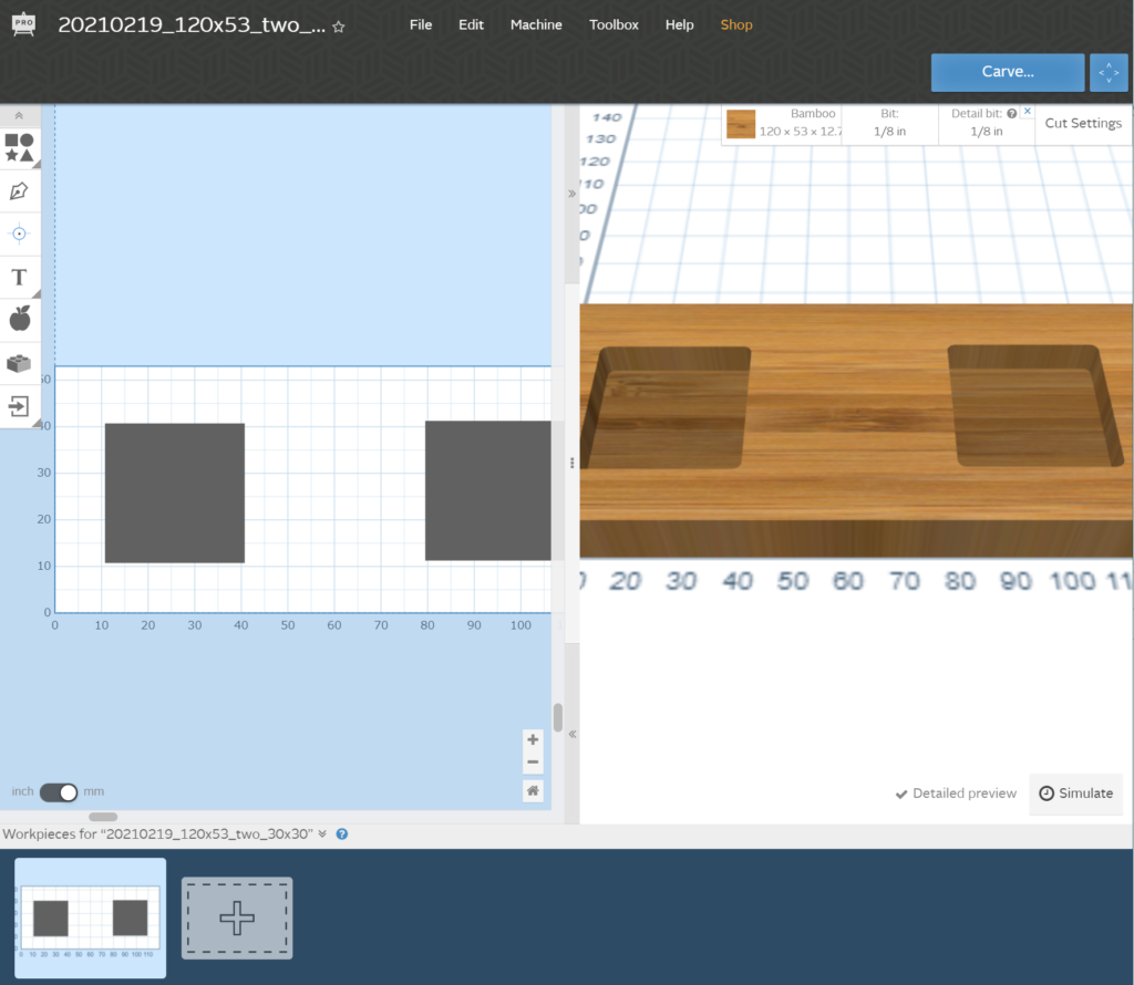 切削のデザイン・出力はEasel( https://easel.inventables.com/projects/、g-code )を用いました。