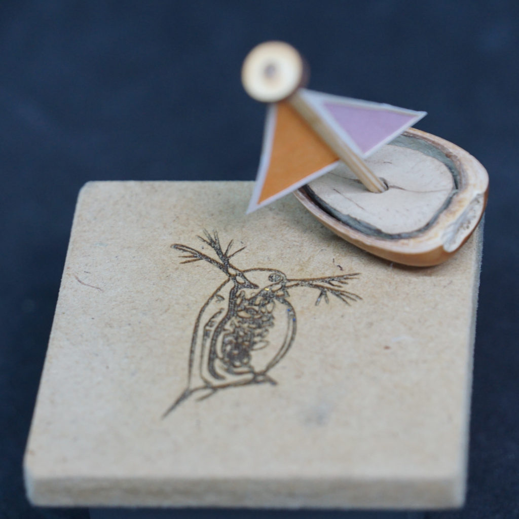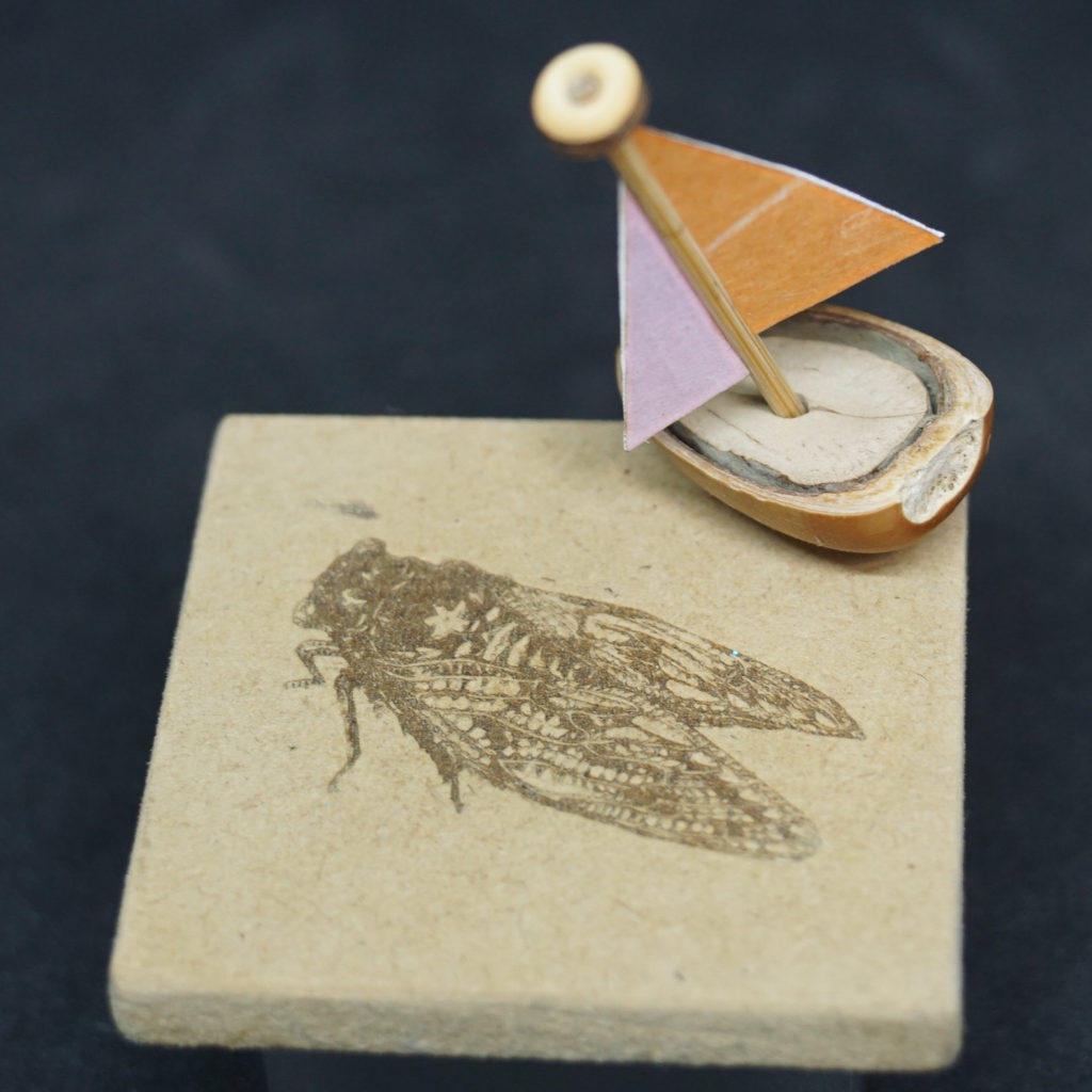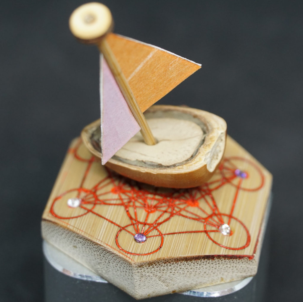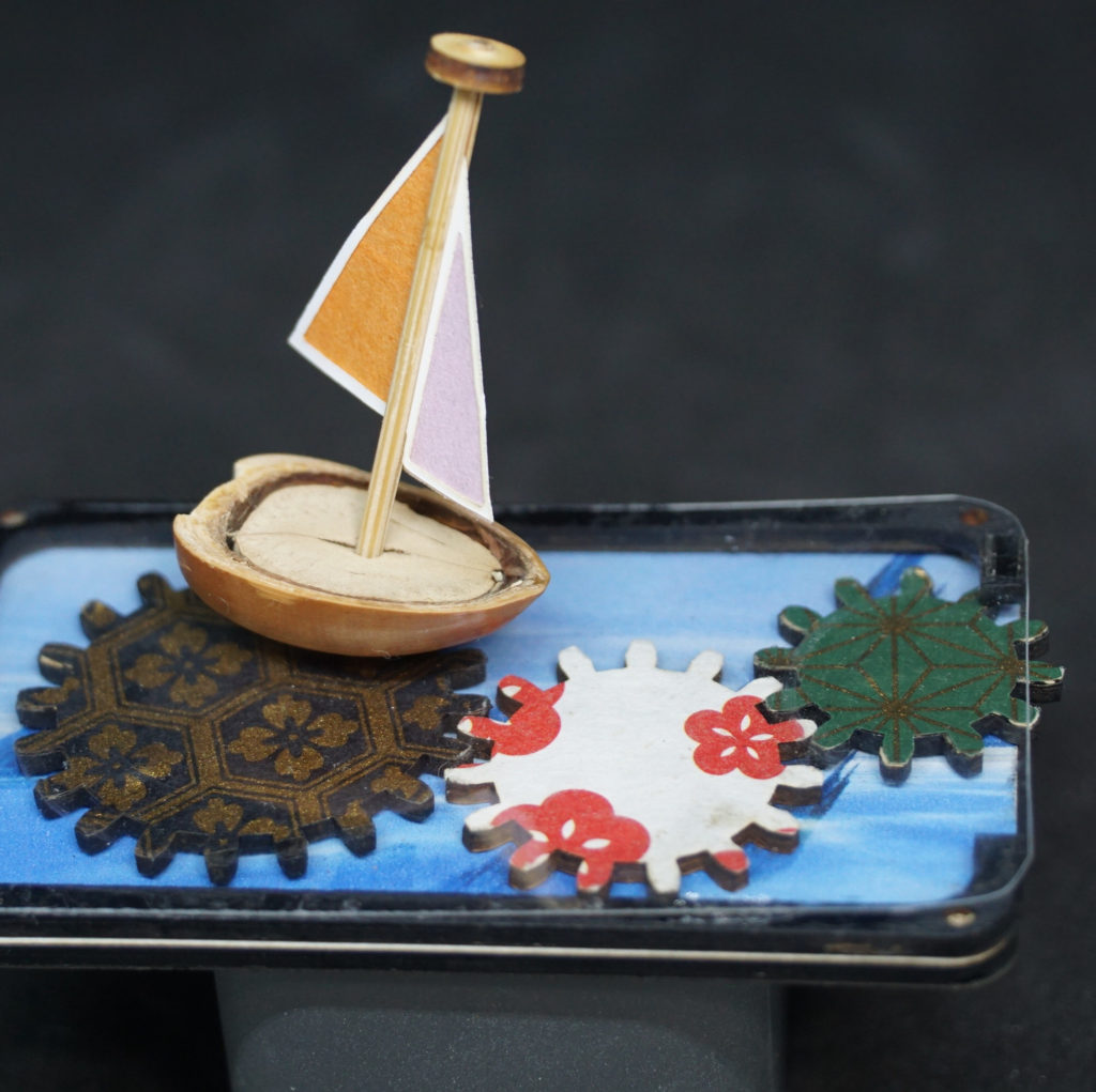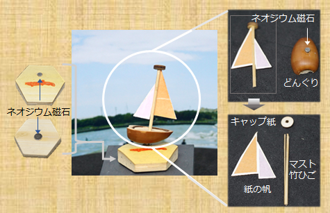 藤沢でとれたどんぐりを60℃で1時間煮沸後に切断して船体にします。木の実と外皮を接着後にマストを立てる穴を設け、外側の底部にネオジウム磁石を接着しています。