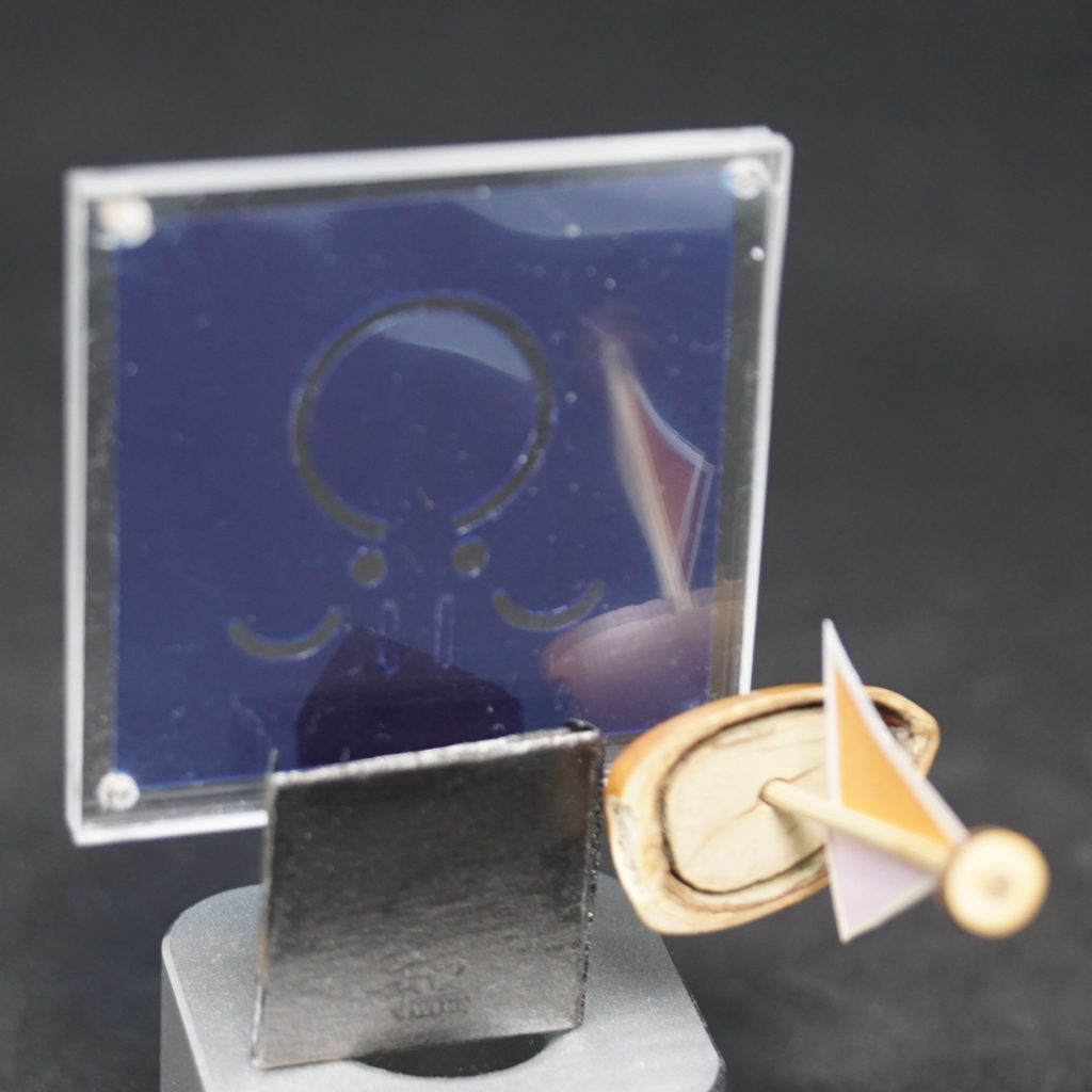 帆は紙のガイドに和紙を貼り付けています。マストはΦ1.8 x 40 mmの竹ひごを半分に割り、これに帆を挟み先端部をキャップしてあります。縦横が2.5 x 2.5cmの帆とキャップはレーザー加工機で切り出しました。帆を挟んだマストをどんぐり船体の穴に差し込み完成です(接着はしていません)。