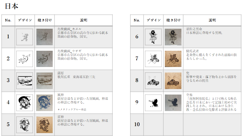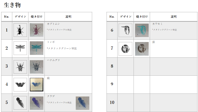 カテゴリー毎にデザインとDMF板へのレーザー焼き付け結果をまとめました。尚、一部のDMF板レーザー加工板には有機溶剤系のメタリック塗装やサンドペーパーによる研磨加工を試みました。