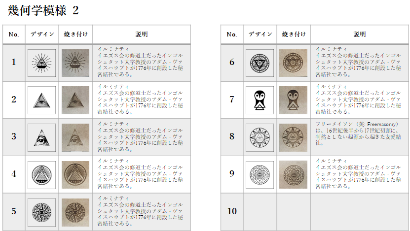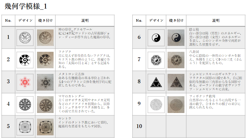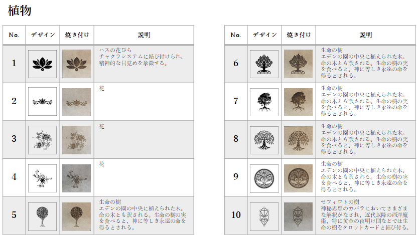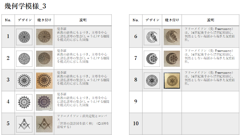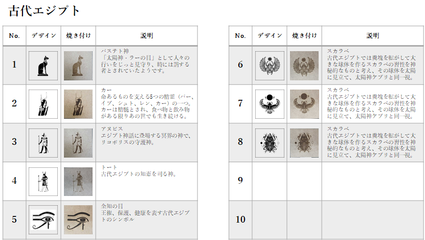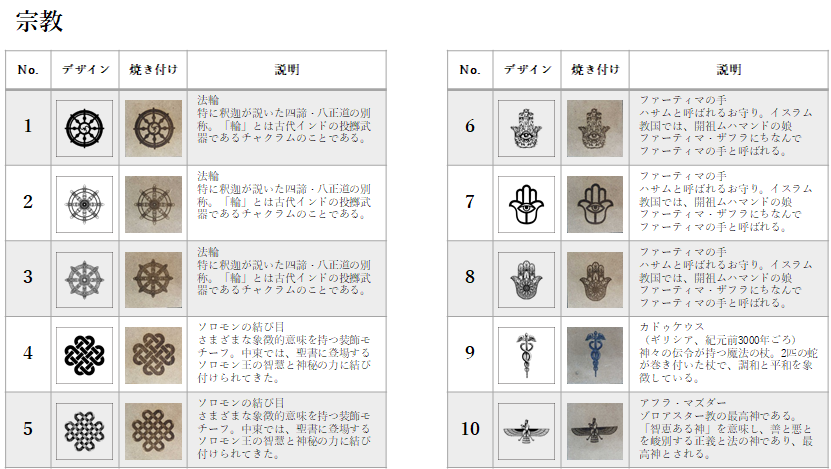 特に古代からのシンボルなどは、そのもつ意味合いが興味深く、含めて数多く焼き付けました。「100の神秘から読み解く世界のシンボル」サラ・バートレット (著), Sarah Bartlett (著), ボーンデジタル社, 2016年にはインターネットでは見つけにくいデザインが掲載されており、多いに参考にしました。
