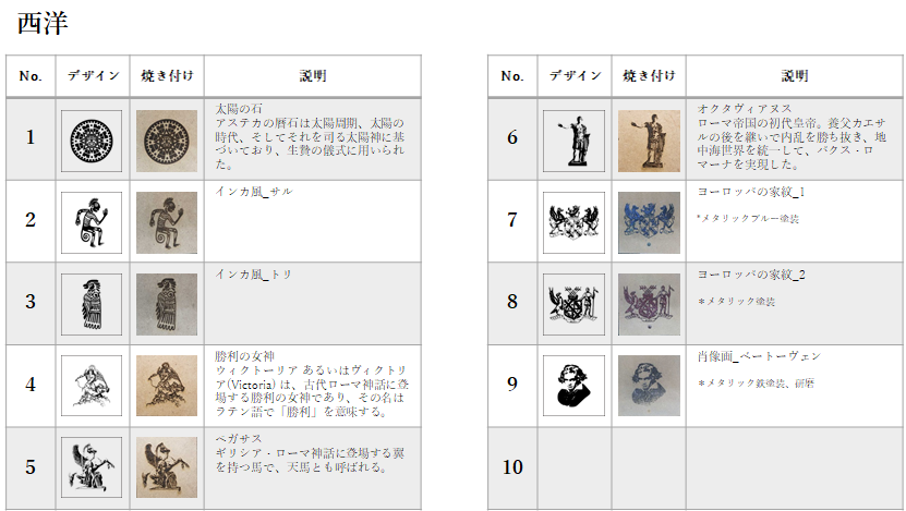 均一な材質で加工が容易なDMF板(Medium Density Fiberboard)にレーザー印字を行うにあたり各種デザインを検討しました。デザインとして選んだテーマは、生き物、古代エジプト、植物、空想の生き物、日本、西洋、宗教そして幾何学模様です。