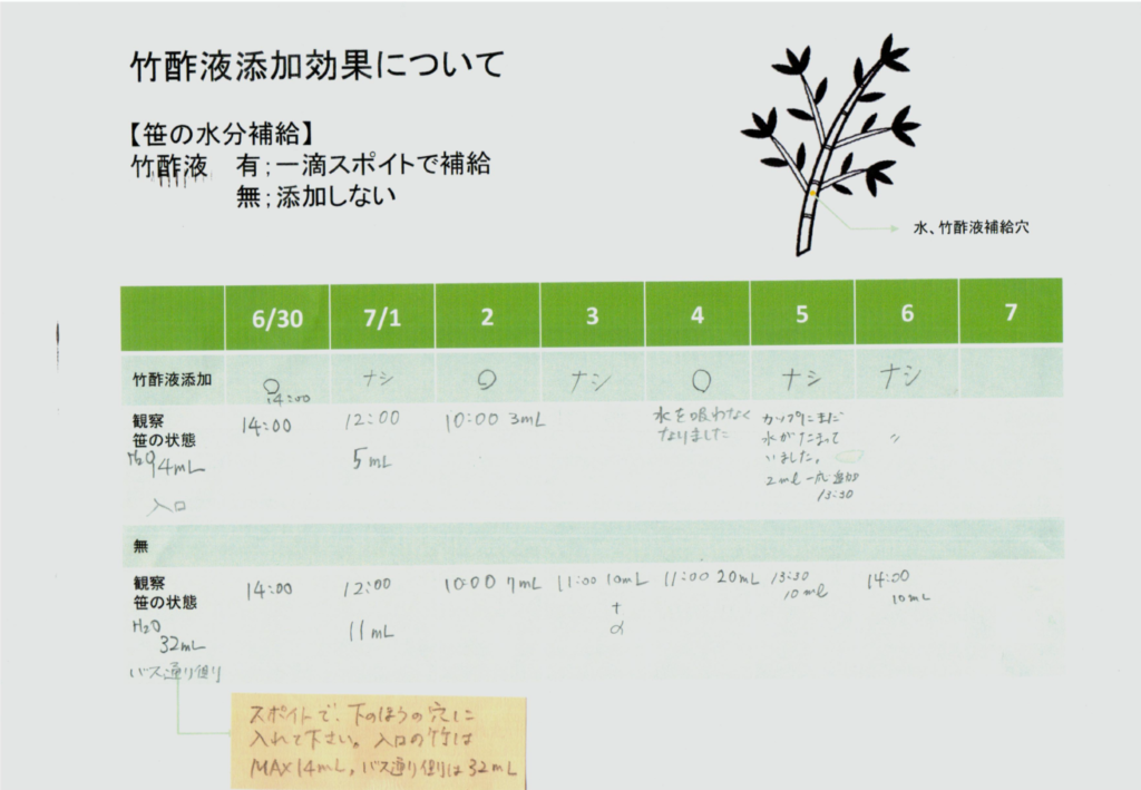 竹酢液添加と給水は見守りの方々にお願いしましたが、スポイトではどれくらい水が節に入っているのか分からないとのことで、設置から二日後に簡易の給水タンクを設置しました。