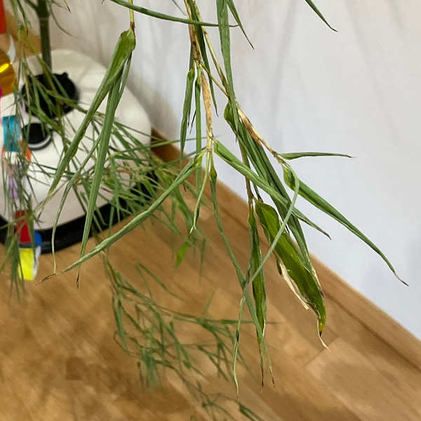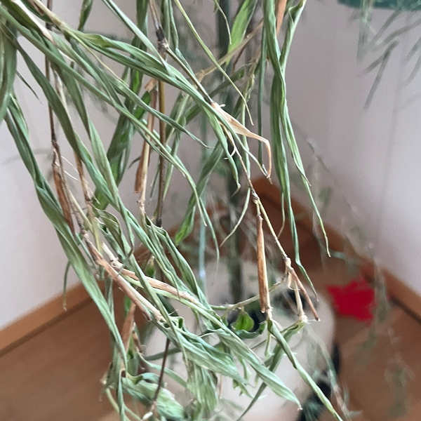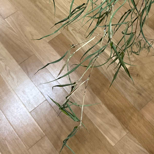 設置直後の笹の葉の写真です(左が入り口、右が室内)。この時点で既に葉が丸まっています。