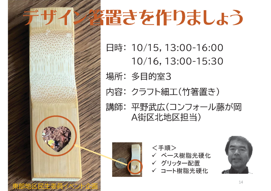 参加予定者が高齢者であることを想定して、箸置きの作成コーナーを設けました。予め箸置きに整形した竹材に、CNCルーターで種々の穴を開けた素材を提供しました。当日はこの穴にグリッターを配置し光硬化性樹脂で固めて、ご自身で箸置きを作成頂くように準備しました。