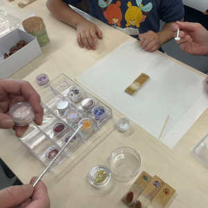 この手間のかかる素材を提供する上での懸念事項は、工作の説明員でした。細かいグリッターを少量渡したり、光硬化性樹脂を適量塗布したり、さらに紫外線照射ランプで固めたりすることをこなせるかどうかでした。
