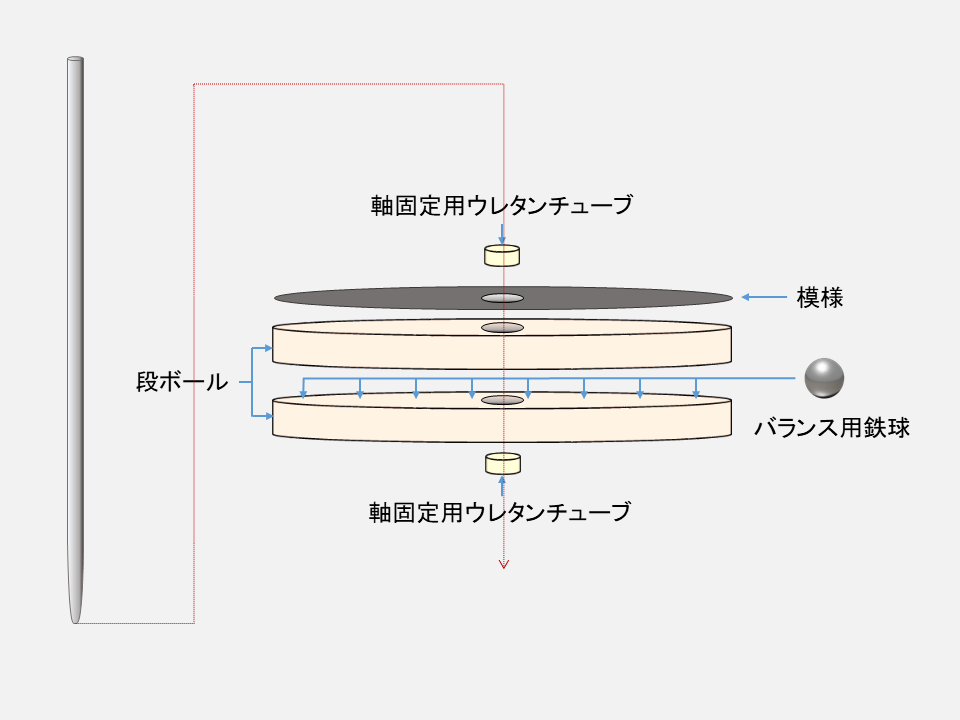 その結果、うまくバランスをとることによって1分以上安定に回転し続ける、段ボールコマを得ることができました。構造図を下記に示しました。