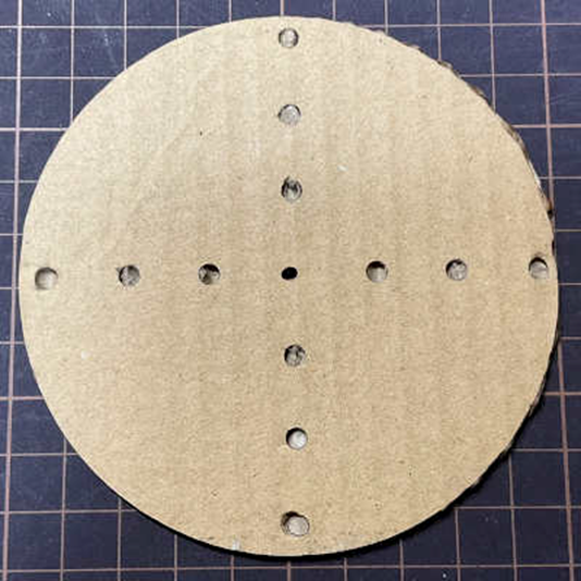 少ない重りの数で長く回ったのは24穴の外周部分8か所に鉄球を配置した場合でした。遠心力により回転中に鉄球が飛び出さないように、同じ段ボールの加工した円上下で挟む仕様にしました。