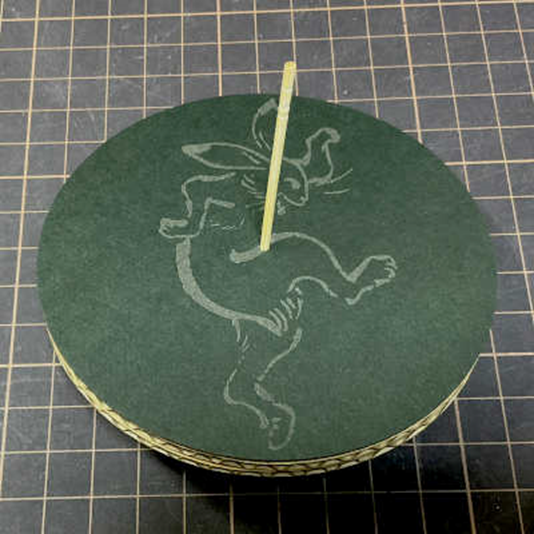段ボール面を覆うために、黒厚紙に本年の干支であるウサギをレーザー光で焼き入れた完成図です。長く回転するので、ベンハムのコマの色の変化を楽しむこともできます。