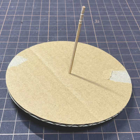 梱包用の段ボールを使ってコマを作ってみました。直径10cmの、中心円径1.8mmの円を切り出し、つまようじを軸にしてみました。