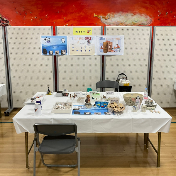 今回の新しい試みは、無料の工作(ジャンプコップ作成)教室と知り合いの陶芸家とのコラボレーションです(陶芸作品は写真右手前)。