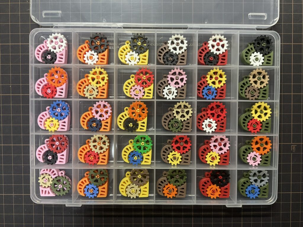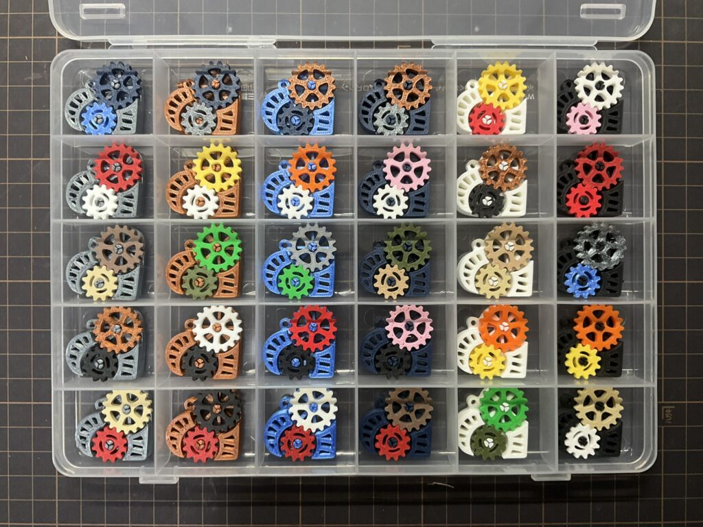 並行して、3Dプリンタで作成した3つの歯車を組み合わせたキーホルダー工作も行いました。少し小さめにサイズ設定したので、軸受けが折れやすくなっていて、歯車装着時に軸が折れるものがありました。