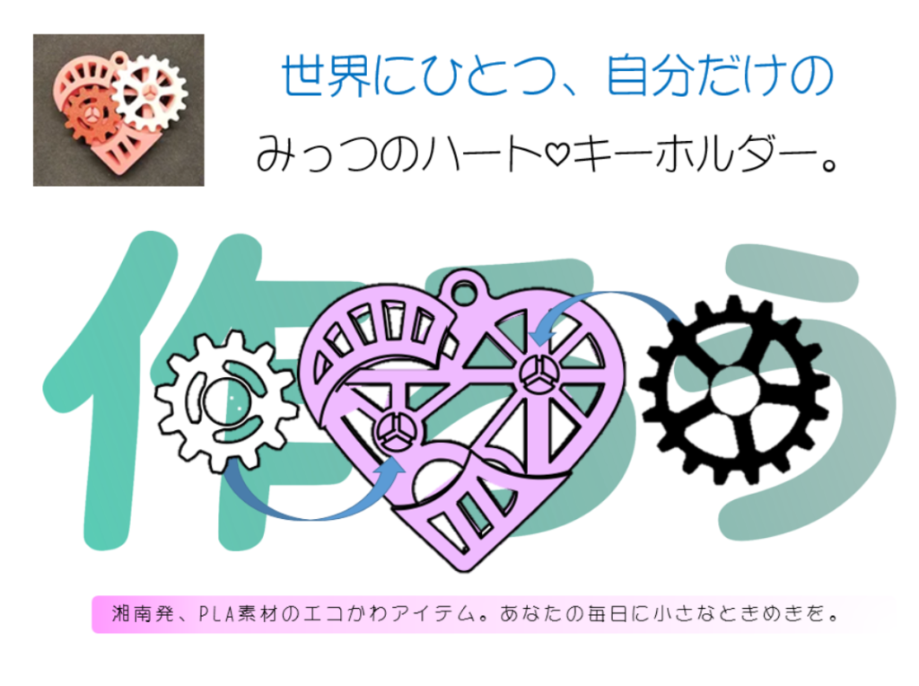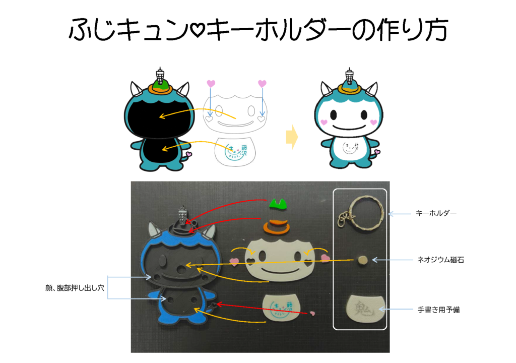 販売品は「きゅんとするまち藤沢」のロゴが入っており、工作品はロゴが入る場所が空白で、マジックで自由に落書きをして自分だけのオリジナルキーホルダーをつくります。工作では顔、お腹、そして好きな色のハートをはめ込み、裏面にネオジウム磁石を接着して最後にキーリングをリンクして完成させます。